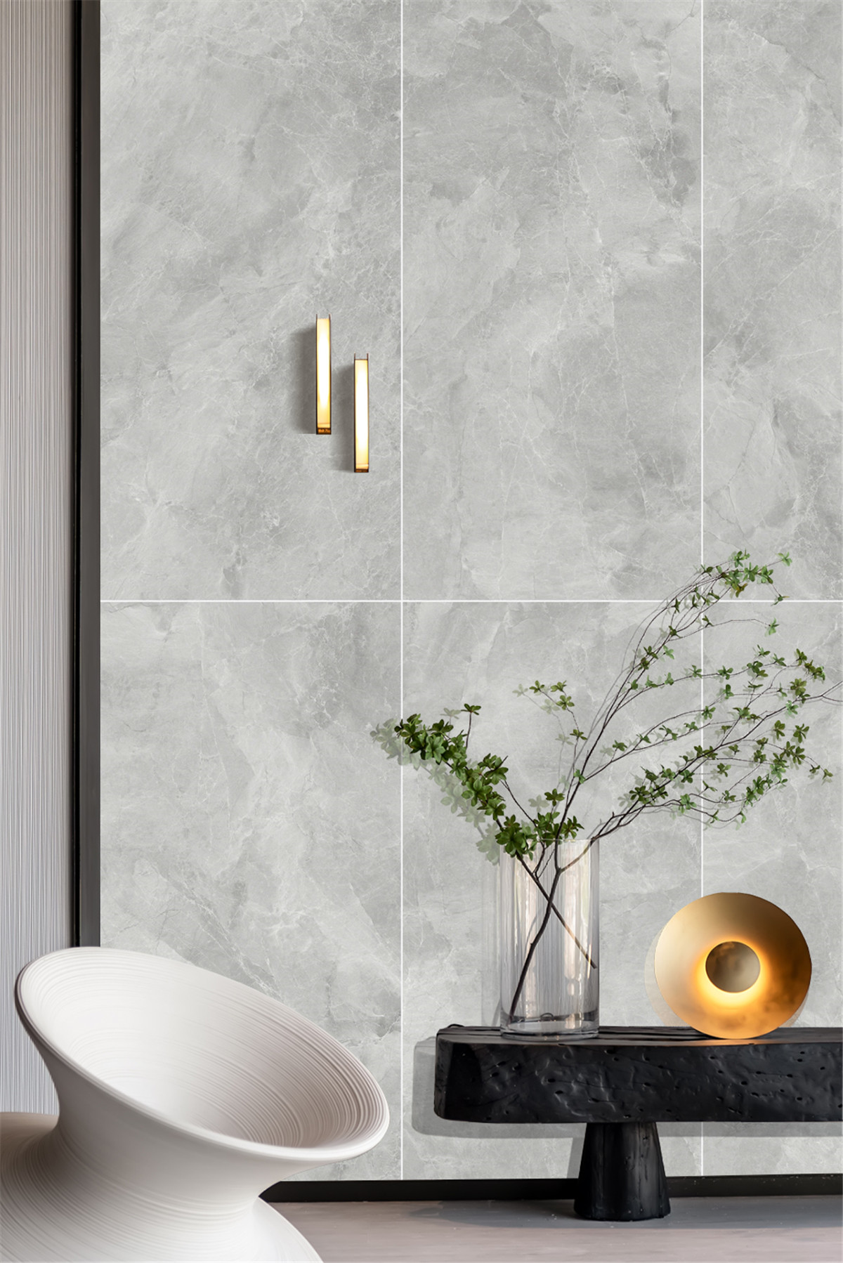 米爾迪蘭紋路多變,灰白交織,并有斑駁點狀紋理錯落分布,外觀時尚而典雅。表面擁有水晶般的光澤,明朗開闊,細致溫潤。