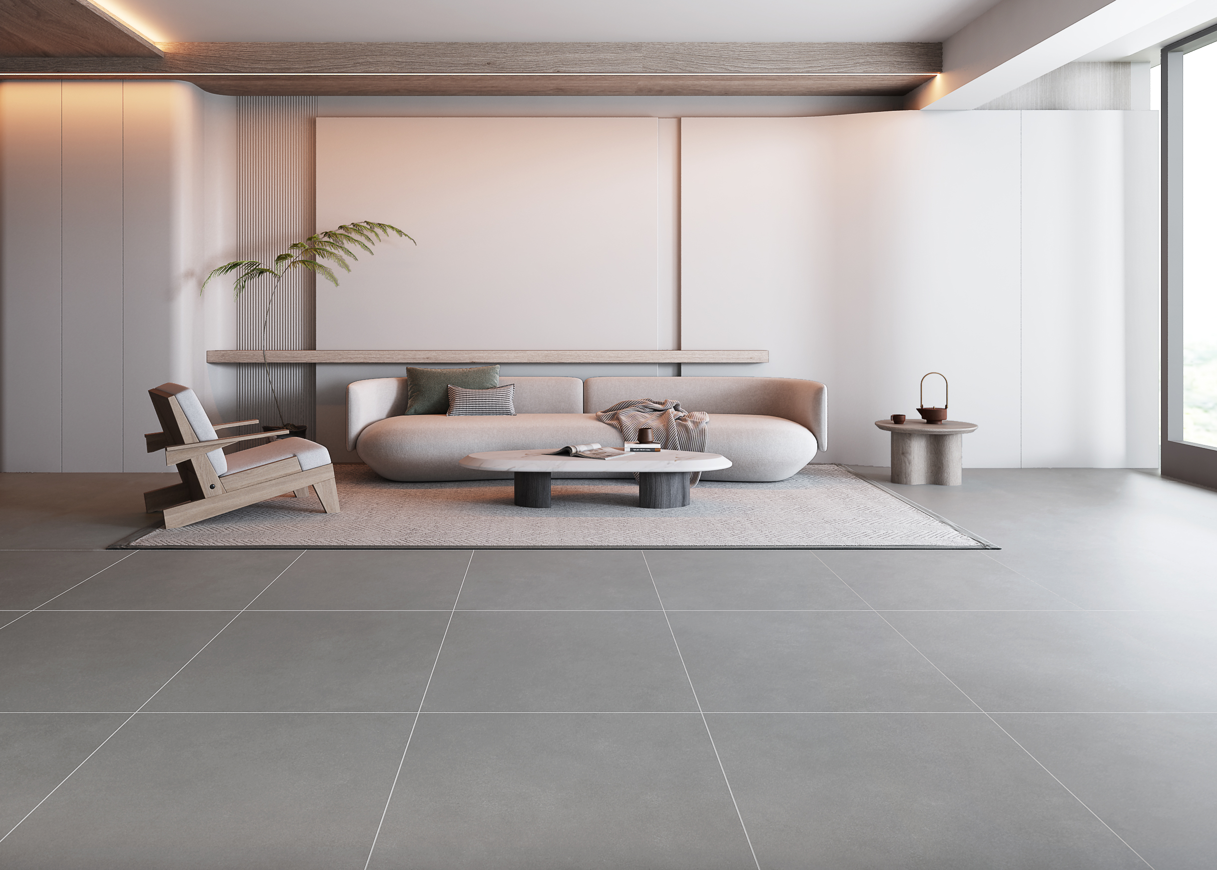 柔和的色彩和諧交融,點綴些許棕色元素,部分空間以淺灰白色作為中間色搭配調和,帶有一絲復古韻味,整體空間呈現出休閑舒適、溫暖自愈的視覺效果。