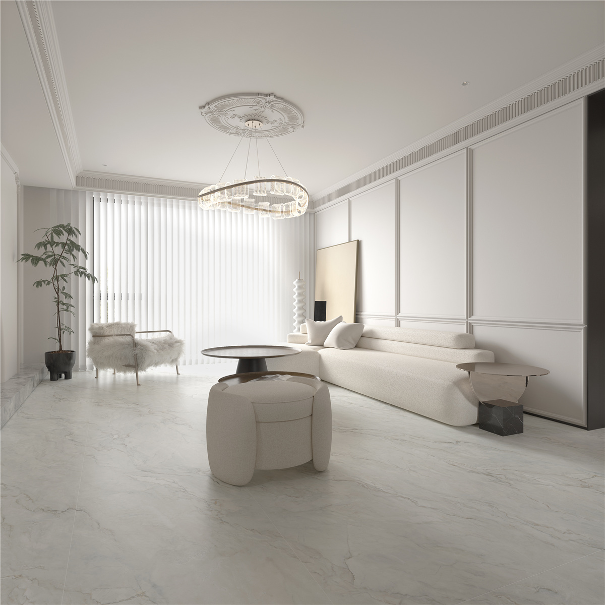 “冰川白” 以其純凈的色澤與細(xì)膩的質(zhì)感,為整個(gè)空間奠定了高雅而柔和的基調(diào),微啞的光澤在光線的映襯下,更顯溫潤(rùn)與細(xì)膩。