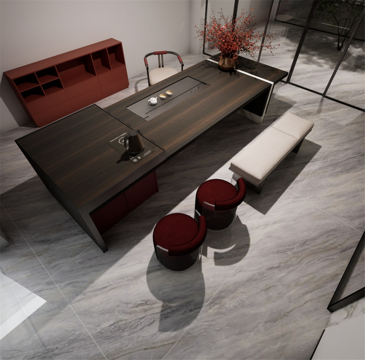 冷冽高級的灰色線性紋理如冰川裂隙般的自然流動感,將浩瀚自然濃縮于方寸,冰川裂隙在暮光中蜿蜒的脈絡,冷玉質感下暗涌著能量,讓空間瞬間化為充滿靈性的自然秘境。