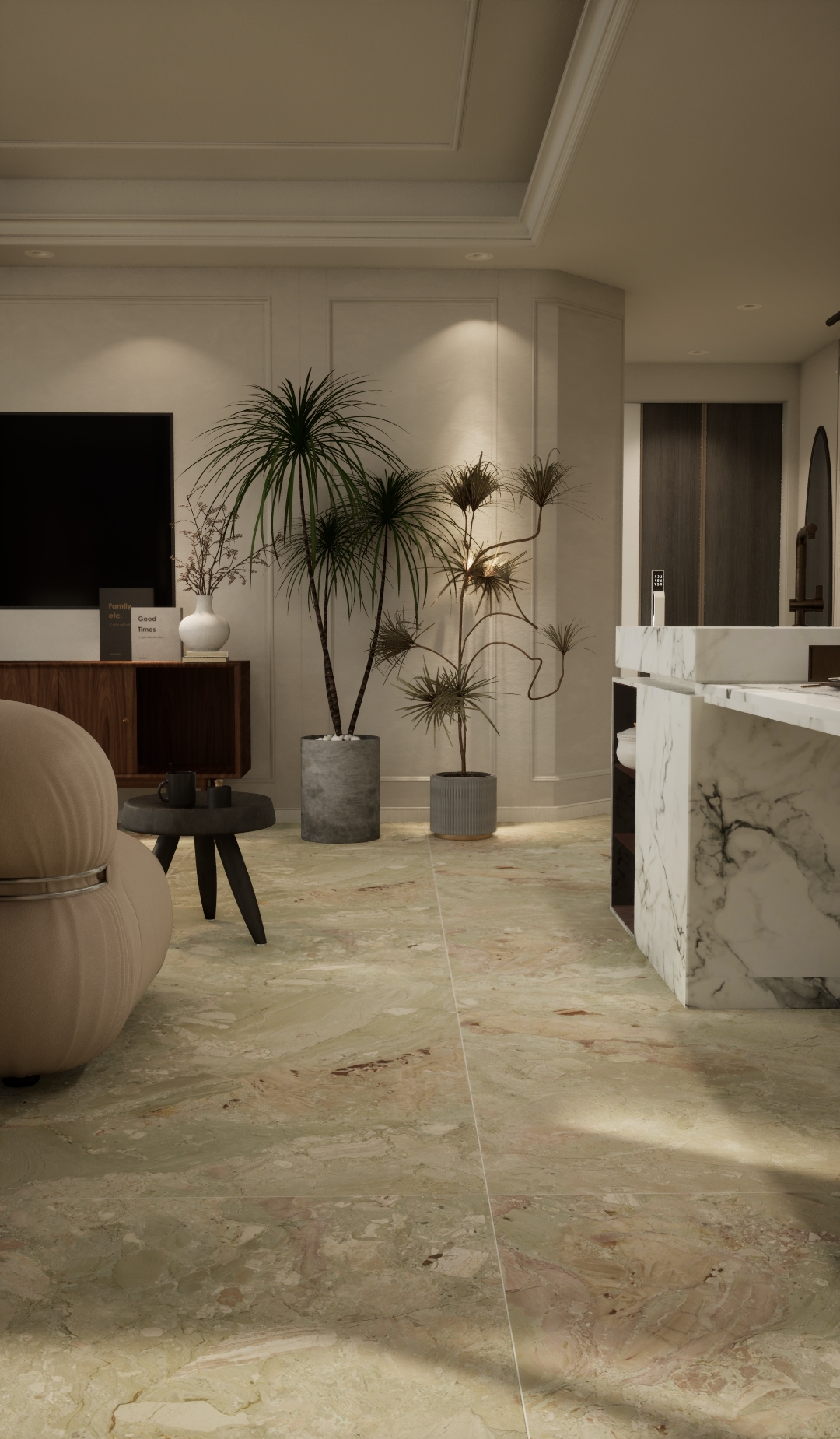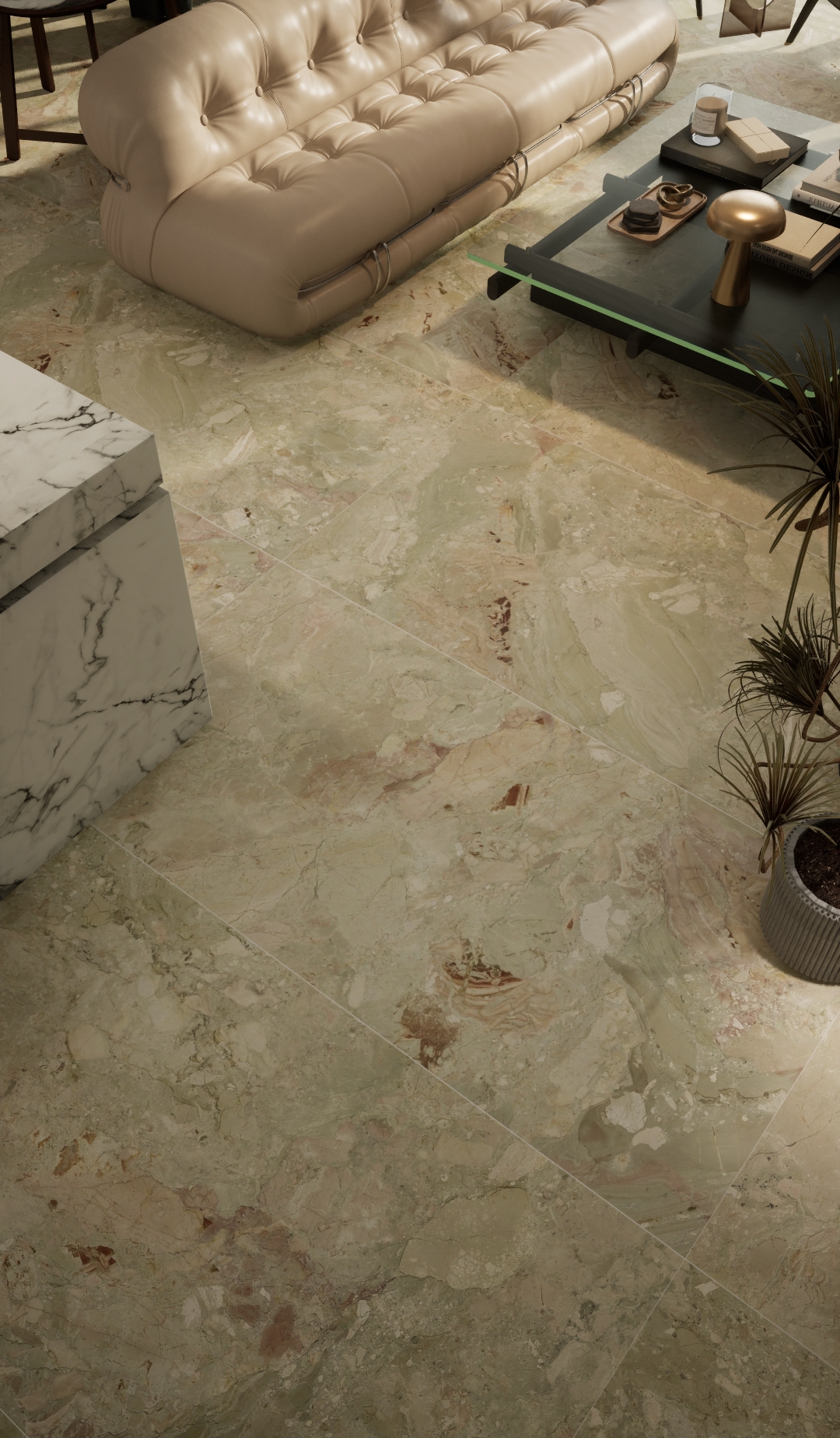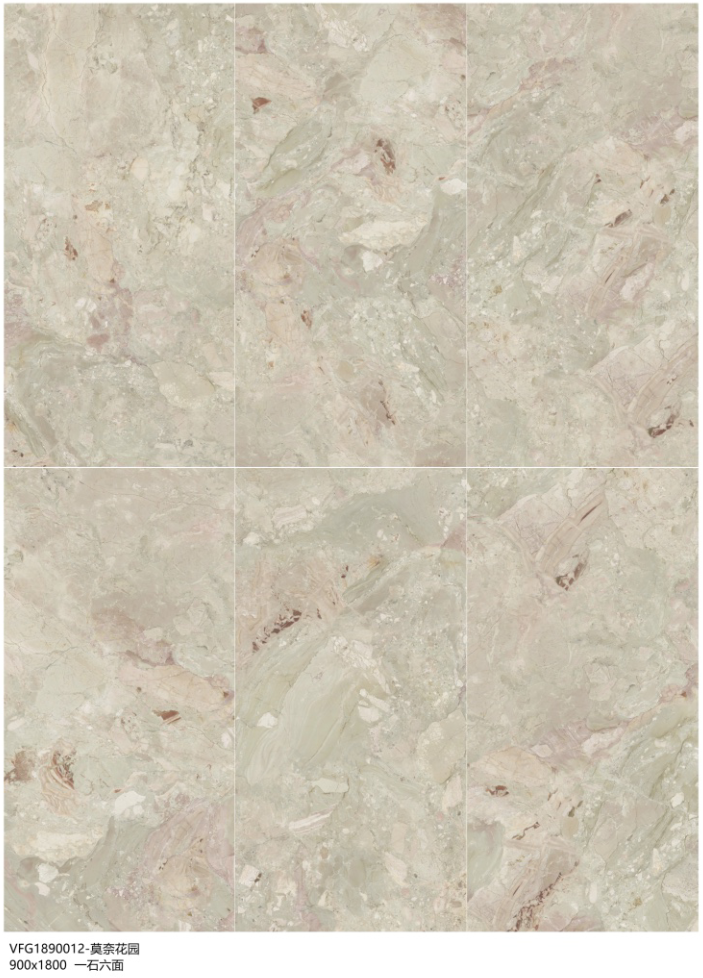 以柔和的粉綠調交織呈現,紋理如自然石材的暈染肌理,粉色與淺綠色相互交融,其間點綴著細微的金棕色澤,似春日里的繁花石景,細膩且富有層次。鋪貼后為空間注入清新雅致的氛圍,是打造輕奢風或自然系家居的獨特選擇,讓空間在柔美中盡顯藝術質感。