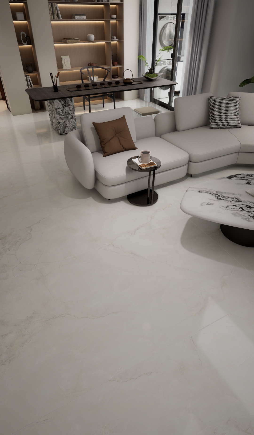 融合冷白基色與玉石般溫潤通透的釉面肌理。質(zhì)地堅硬,耐磨防滑,表面泛著冰雪清輝般的柔光。適用于營造清雅、高潔且富有禪意的室內(nèi)空間。靈感源于冬江覆雪與和田白玉的意象交融。其質(zhì)地似冰肌玉骨,清冷中透著溫潤,紋理如寒江暗涌。能為新中式、現(xiàn)代禪意或高端商業(yè)空間,注入…